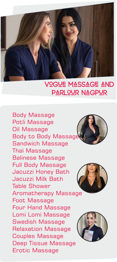 We offer massage in nagpur like Body Massage, Potli Massage, Oil Massage, Body to Body Massage, Sandwich Massage, Thai Massage, Balinese Massage, Full Body Massage, Four Hand Massage, Lomi Lomi Massage, Swedish Massage, Relaxation Massage, Couples Massage, Deep Tissue Massage, Erotic Massage, Jacuzzi Honey Bath, Jacuzzi Milk Bath, Table Shower, Aromatherapy Massage, Foot Massage